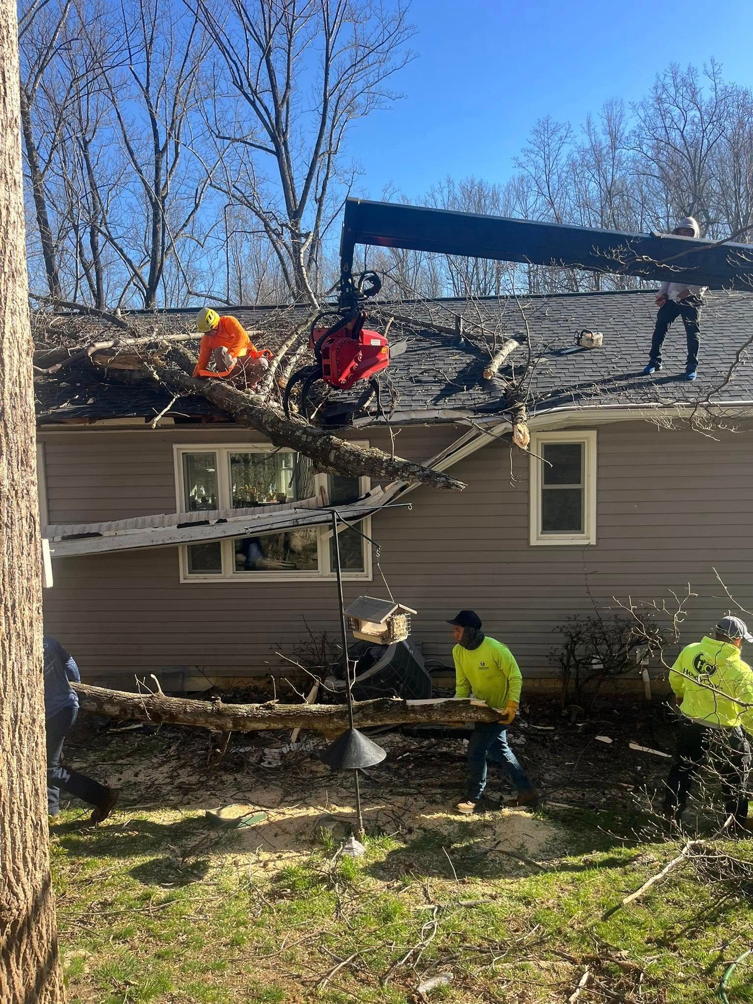 Our crew responded to a severe situation where a large tree had fallen directly onto a home, causing significant damage. Using our crane truck, we carefully removed the tree to prevent any further structural harm and to help make the area safe for repairs.